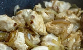 - Βράζετε το κοτόπουλο και τα αυγά μέχρι να ψηθούν και τα αφήνετε να κρυώσουν. Περιχύνετε τα κρεμμύδια με βραστό νερό, στη συνέχεια τα κόβετε σε μισά δαχτυλίδια και τα μαρινάρετε σε ζάχαρη και ξύδι για 15 λεπτά.